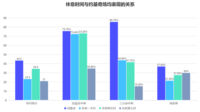 What is even more exaggerated is that for Jokic, this has not yet used all his strength. In back-to-back games, Jokic averaged 43.5 points per game, with two shooting percentages as high as 75.7% and 85.7% respectively, and also had the highest usage rate. , On the contrary, Jokic's scoring output in the game after the break was relatively low, which means that in the back-to-back fatigue situation, Jokic, as the leader, assumed more firing rights and had excellent scoring output and efficiency. On the contrary, he gave more easy scoring opportunities to his teammates.