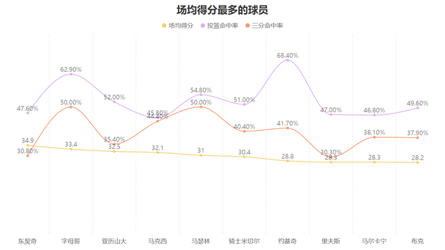 Jokic failed to break through Caruso's entanglement in the playoffs last season. In the first game of the new season, he encountered the super god Curry and ushered in a bad start. However, as the season progressed, Jokic gradually adapted to the development of the game. Now dominant, after the game against the Clippers, Jokic ranked seventh in the scoring list with an average of 28.8 points per game. At the same time, his two shooting percentages of 68.4% and 41.7% were also at the top level among the 10 players with the most points.