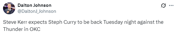 Curry is expected to return to play against the Thunder! The Warriors encounter a hellish devil s schedule: 9 days, 6 consecutive away games + 2 times, 3 games in 4 days
