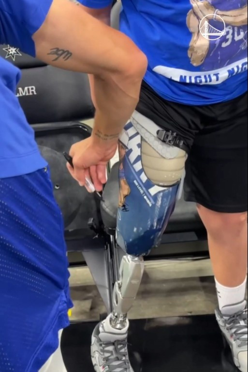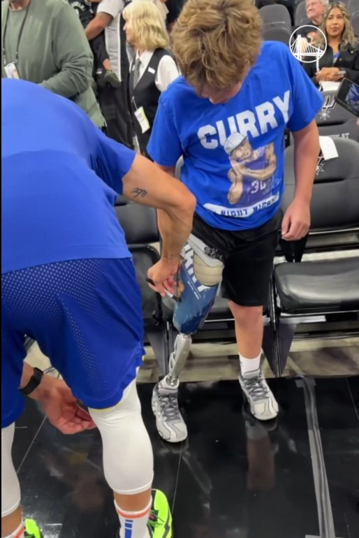 GIF-One-legged little fan calls Curry his favorite player Curry takes a heart-warming photo + autographs his prosthetic limb for fans