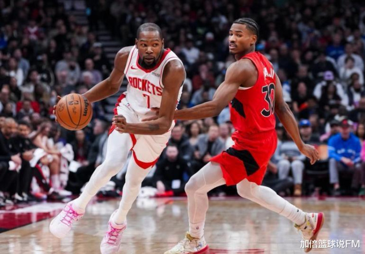 In this game, the two sides have starting lineups. The Rockets sent Durant, Smith Jr., Shen Jing, Okogie and Amen Thompson, and the Raptors sent Ingram, Barnes, Boyles, Barrett and Quickley. At the beginning of the first quarter, Ingram made an extreme fadeaway jumper and scored the first goal of the game. Smith Jr.'s chasing three-pointer also opened the door for the Rockets. Ingram continued to hit a long three-pointer from the front. Barrett made a fake shot and flew up against Durant for a layup. Shen Jing caught the ball under the basket and struggled to clear the board and scored. Shen Jing made a strong three-pointer and confidently hit the net. Soon, the Rockets took the lead and took the initiative. All three-pointers felt hot, and a small climax established a 10-point lead. At the end of the first quarter, the Rockets led the Raptors by 9 points 39-30.
