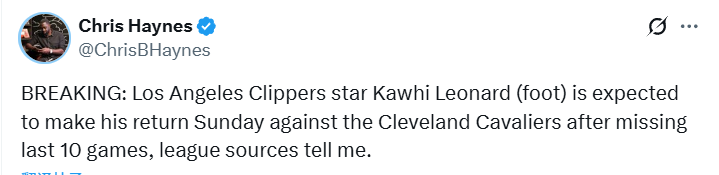On November 23, according to a report by journalist Chris Haynes, Clippers forward Kawhi Leonard is expected to return on Monday () against the Cleveland Cavaliers.