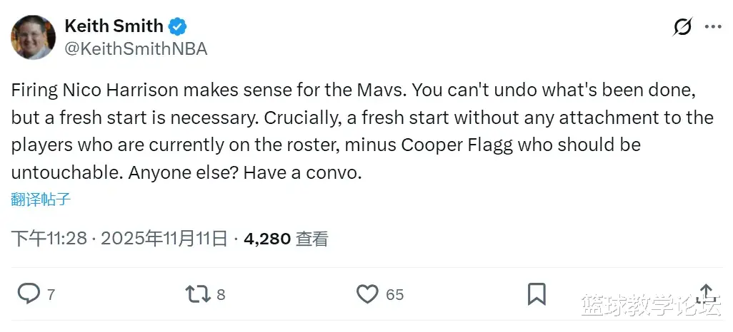 Since the deal between Doncic and Big Eyebrow was reached, the Lakers have achieved 30 wins and 16 losses, while the Mavericks have only 16 wins and 28 losses. Another reporter, Keith Smith, believes: "The Mavericks made the right choice to fire Harrison. He must be responsible for the Mavericks' mess. The Mavericks should start trade negotiations, and everyone else except Flagg can be put on the negotiating table."