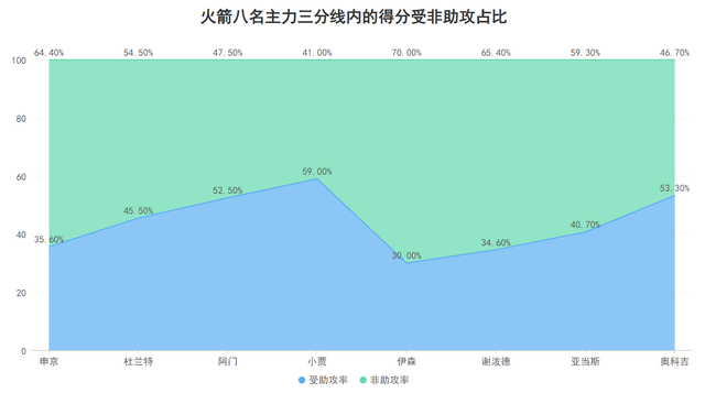 The strong offensive ability is the key to the Rockets' strength this season. Most of the Rockets' main players have reached a state of extremely balanced scoring and non-assist ratios. Among the eight main players of the Rockets who average more than 20 minutes per game, their three-pointers The scoring inside the line with assists and non-assists is relatively close, which means that they can either catch the ball and complete the game, or they can create scores without relying on assists from teammates. Although the starting point guard VanVleet is injured and truce, the Rockets have changed into an offensive mode in which multiple people can hold the ball, making it difficult for opponents to defend.