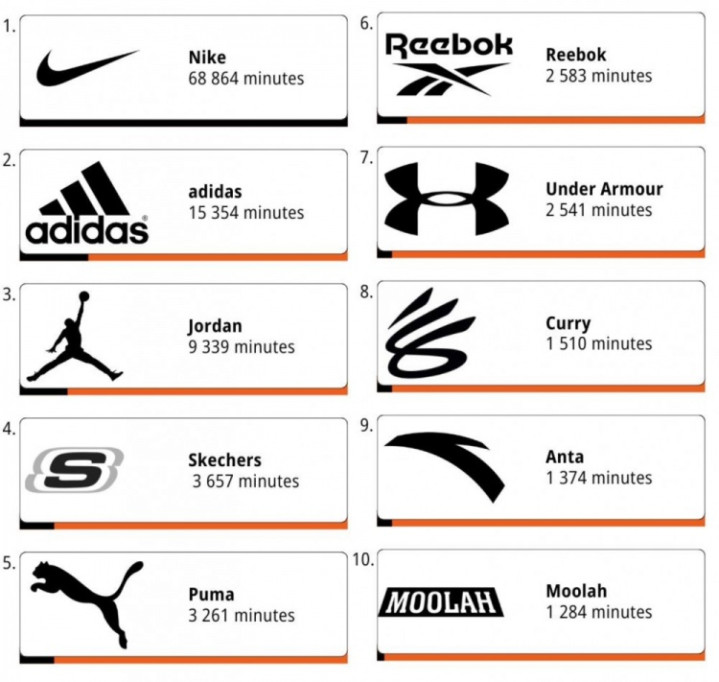 In the brand ranking of time of playing time, Nike ranked first with 68,864 minutes, and domestic brands also appeared in the top ten.