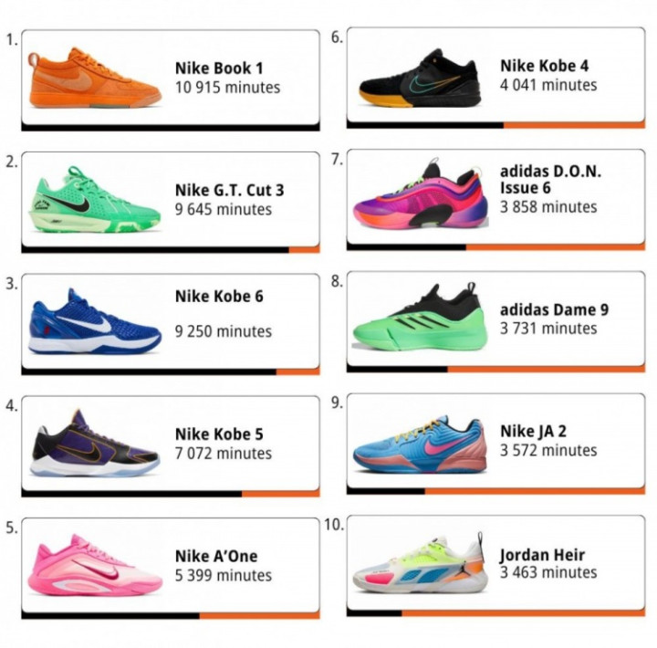 Among them, Booker's signature shoe Book1 ranked first, with a total of 10,915 minutes of playing time. Kobe's three generations of sneakers are also on the list, including Lillard, Mitchell and Morant's signature shoes.