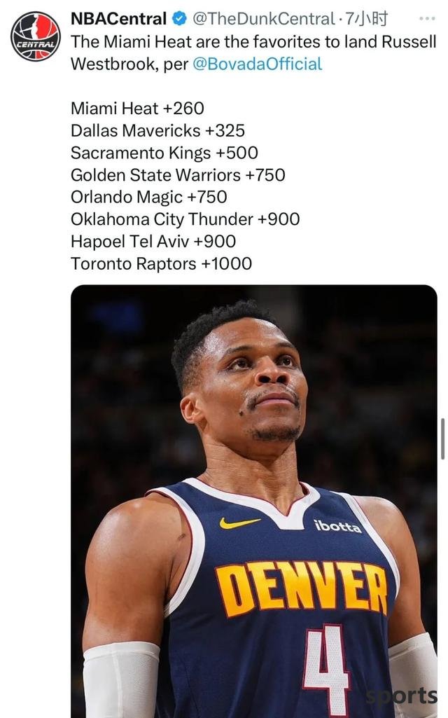 U.S. media NBA Central recently posted Westbrook's new odds, with the Heat ranked first, followed by the Mavericks, with the Kings ranked third, and the Warriors and the Thunder both ranked on the list.