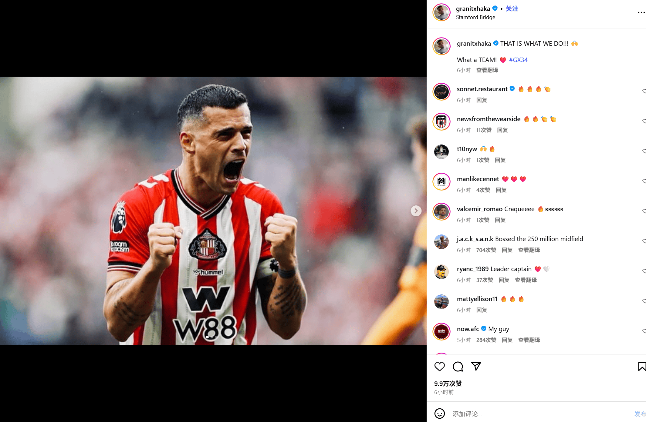 Hupu News on October 26. In a previously concluded Premier League match, Chelsea lost 1-2 to Sunderland. After the game, Sunderland player Xhaka updated social media and posted a message to celebrate the victory.