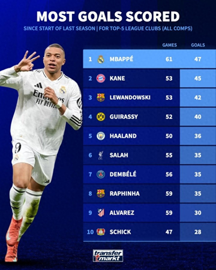 According to German transfer market statistics, Mbappe has scored 47 goals since joining Real Madrid, with the most players in the five major leagues in the same period.