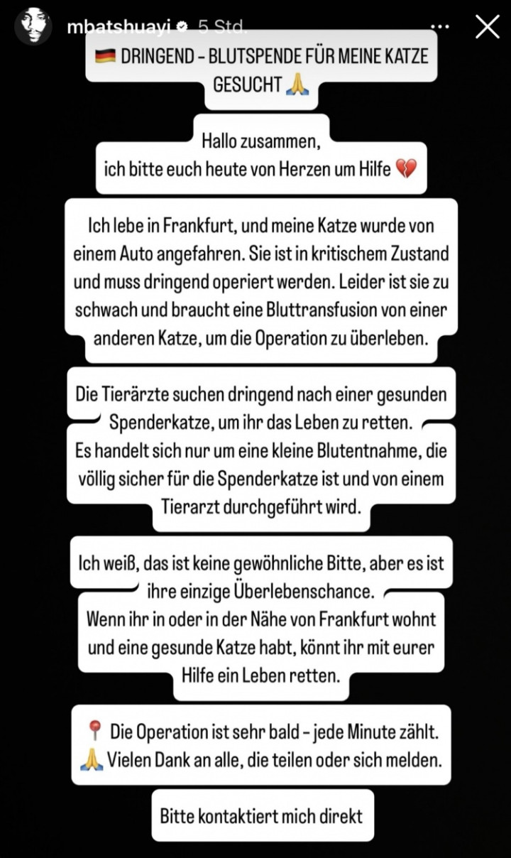 Batshuayi posted on social media that his cat was hit by a car and is currently in critical condition and needs emergency surgery. However, it is weak and needs another cat to donate blood. He emphasized that this is only a small amount of blood drawn and is safe for the cat that donates blood. He hopes everyone can lend a helping hand.