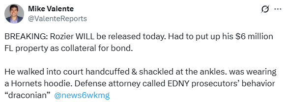 Mike Valente continued to report that Rozier was released from federal prison today. His Florida property worth $6 million has been used as bail collateral, and he must surrender his passport before tomorrow afternoon.