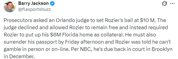 Heat team reporter Barry Jackson reported that prosecutors asked an Orlando judge to set Rozier's bail at $10 million. The judge refused, allowing Rozier to remain free on bail but requiring him to post his $6 million Florida property as collateral. According to NBC, he will appear in court again in Brooklyn in December.
