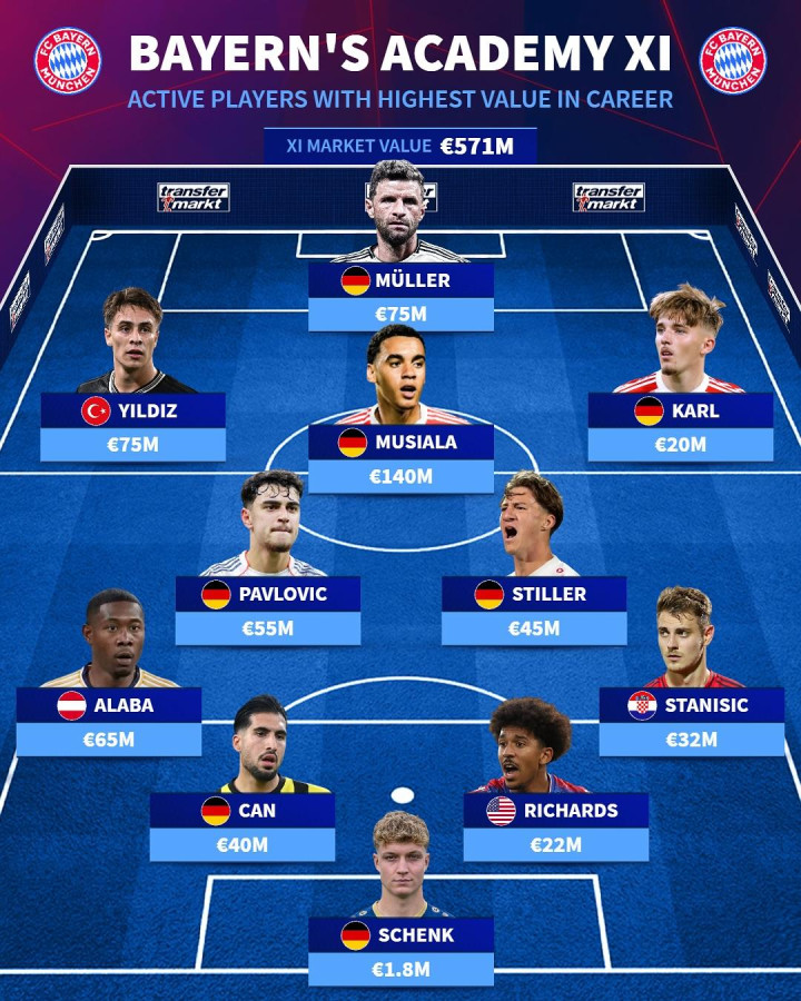 - Current players from Bayern’s youth training: Muller leads the way, Musiala and Karl are listedFootball- Hupu News on October 29th: The German transfer market took stock of the current players from Bayern's youth training and formed a best lineup. [Lineup details] (The value is based on the player's career peak) Goalkeeper: Schenck (1.8 million... - 【Football】 more