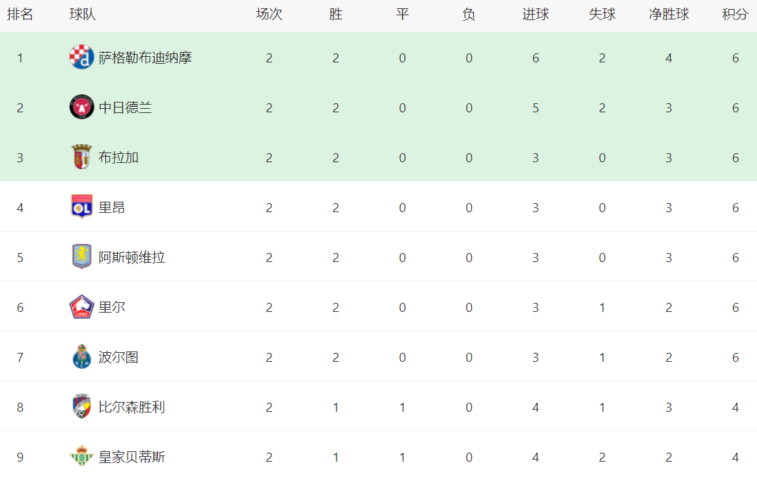 In the standings, Dynamo Zagreb, Central Japanese, Braga, Lyon, Aston Villa, Lille and Porto all won all 2 games and won 6 points. Real Betis scored 4 points. Celta, Rome and Stuttgart all have 3 points. Nottingham Forest, Bologna and Celtic are all 1 point.