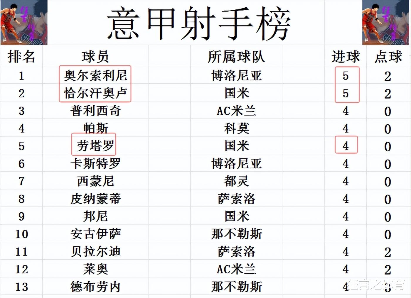 In terms of the scorer list, Serie A's top scorer this season is collective Timmy. Neither Orsolini nor Calhanoglu scored a goal today. They can still hold on to the top spot after scoring 5 goals. Only Serie A among the four major leagues does not have a scorer in double figures. Lautaro and Bonnie scored, catching up with Pulisic, Leo, De Bruyne and others, and tied for third place with 4 goals.