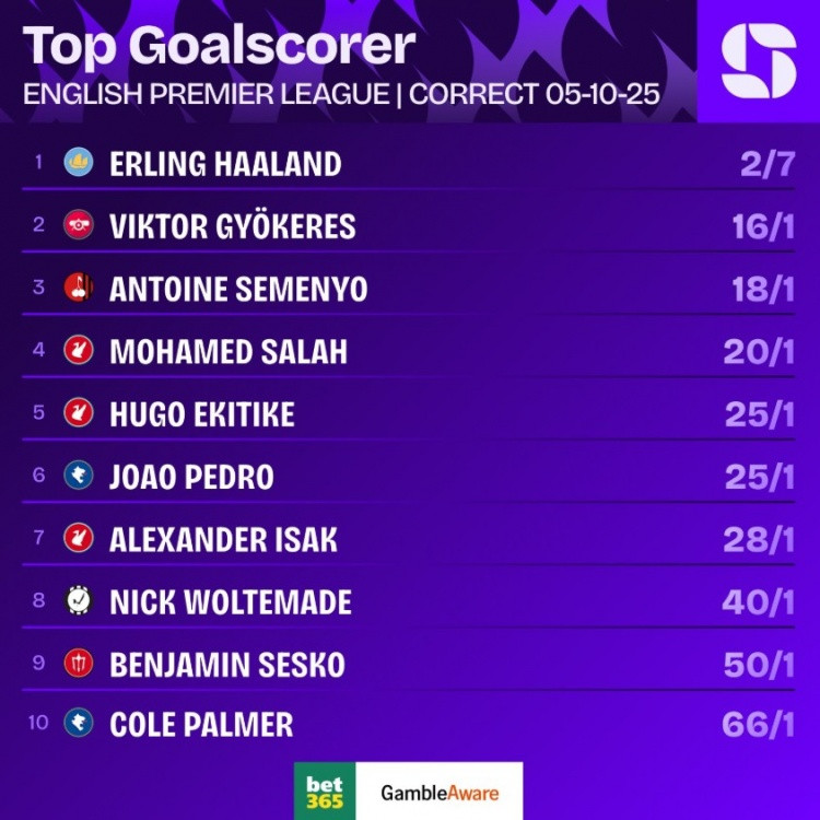Premier League Golden Boot Odds: Haaland is the biggest hit only 2/7, and Yorke ranks second in 1/16