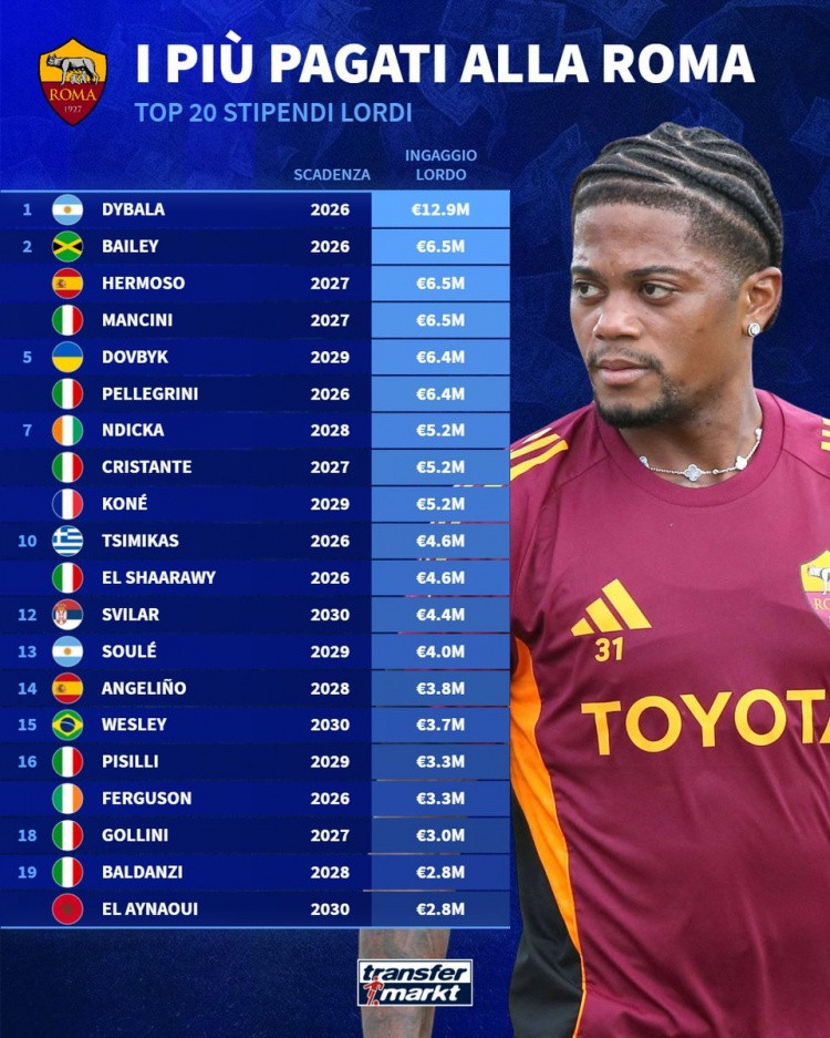 FootballNovember 23: The German transfer market updated the pre-tax salary rankings of Roma players, with Dybala leading the way. The year is when the contract expires, and the annual salaries are before tax: 1. Dybala 12.9 million euros in 2026 2. Leon Bai...