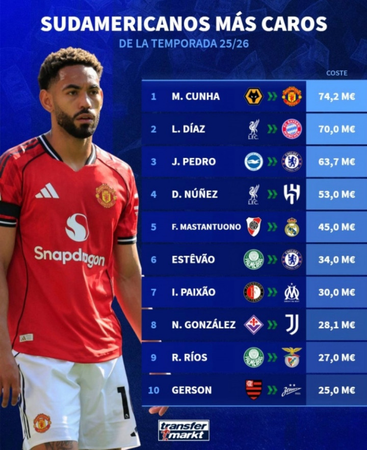 South American player transfer fee list this summer window: Cunya ranked first with 74.2 million euros, Dias second place