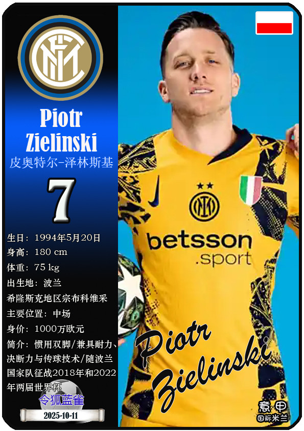 Serie A Inter Milan Football Club was founded on March 9, 1908, which has a history of 117 years. As of October 11, 2025, the team's head coach is Christian Chivu, and the team has players Lautaro Martinez, Marcus Thuram, Piotr Zelinski, etc. This issue displays the current 25 players of Inter Milan Football Club in Serie A in the form of star cards (sorted by jersey number):