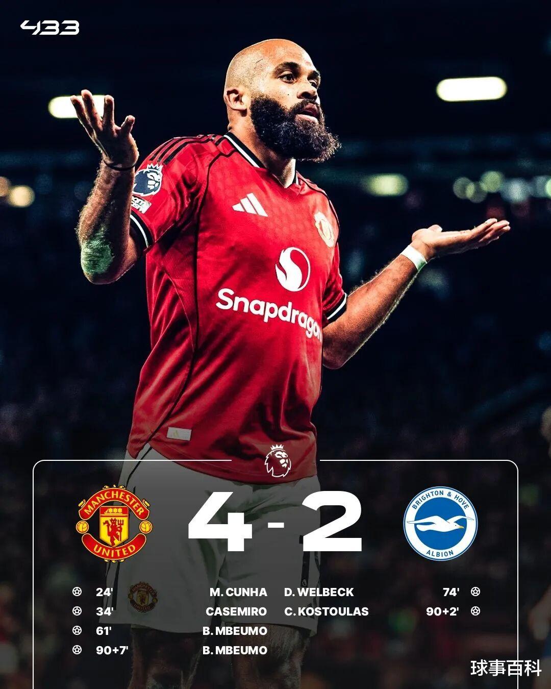On October 26, in the 9th round of the Premier League, Manchester United defeated Brighton 4-2 at home, winning three consecutive victories and temporarily ranking 4th in the Premier League. Considering that Brighton has won three consecutive away games against Manchester United, the two sides started a fierce battle for possession of the ball at the beginning of the game. Brighton tried to induce Manchester United to press forward, while Amorim's team insisted on long passing tactics. 20 minutes later, Cunha opened the scoring for the Red Devils and scored the first goal of Manchester United's career. About 15 minutes later, Casemiro scored with a long shot, extending the score to 2-0.