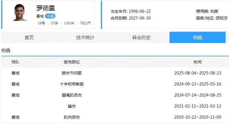According to statistics from medical expert Francisco Delavi, the recurrence rate of players with cruciate ligament injuries within five years is 18%, far exceeding that of athletes in skiing, fencing, tennis, track and field, cycling and other sports. There are also many players who have experienced multiple knee surgeries. The high confrontation of football matches is evident. Rodri has been suffering from minor injuries recently. On the one hand, it may be because his postoperative rehabilitation was not in place and his comeback process was a little hasty. On the other hand, it may be because he was older when he was injured and the hamstring tendon used to help with rehabilitation has not reached the expected strength.