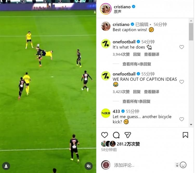 C Ronaldo updated social media after the game, posted a video of his goal scored with an overhead kick, and interacted with fans: "You decide the best caption."